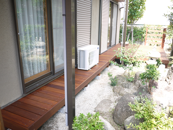 リビング前スペースにウッドデッキを設置、玄関方向にまで濡れ縁タイプのウッドデッキを施工し、つながりをもたせました。既存設置されていた水栓を撤去し新しくデッキ上部に設けました。