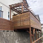 今回は傾斜地にウッドデッキ施工させていただきました。駐車スペースを保ちながらリビングからアウトドアリビングへ。鉄骨で躯体を組み、上部にウッドデッキを施工いたしました。道路前面の柱が車を駐車するのに邪魔にならないようにセットバックしています。開口部も後ろより広くとれるように柱位置をサイドにずらしました。