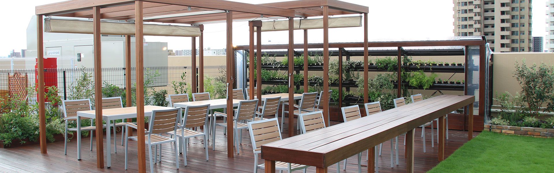 コンテナの上にウッドデッキスペースを施工。天井部分に比重がかからないように、鉄骨で下地を。素敵なウッドデッキスペースになりました。